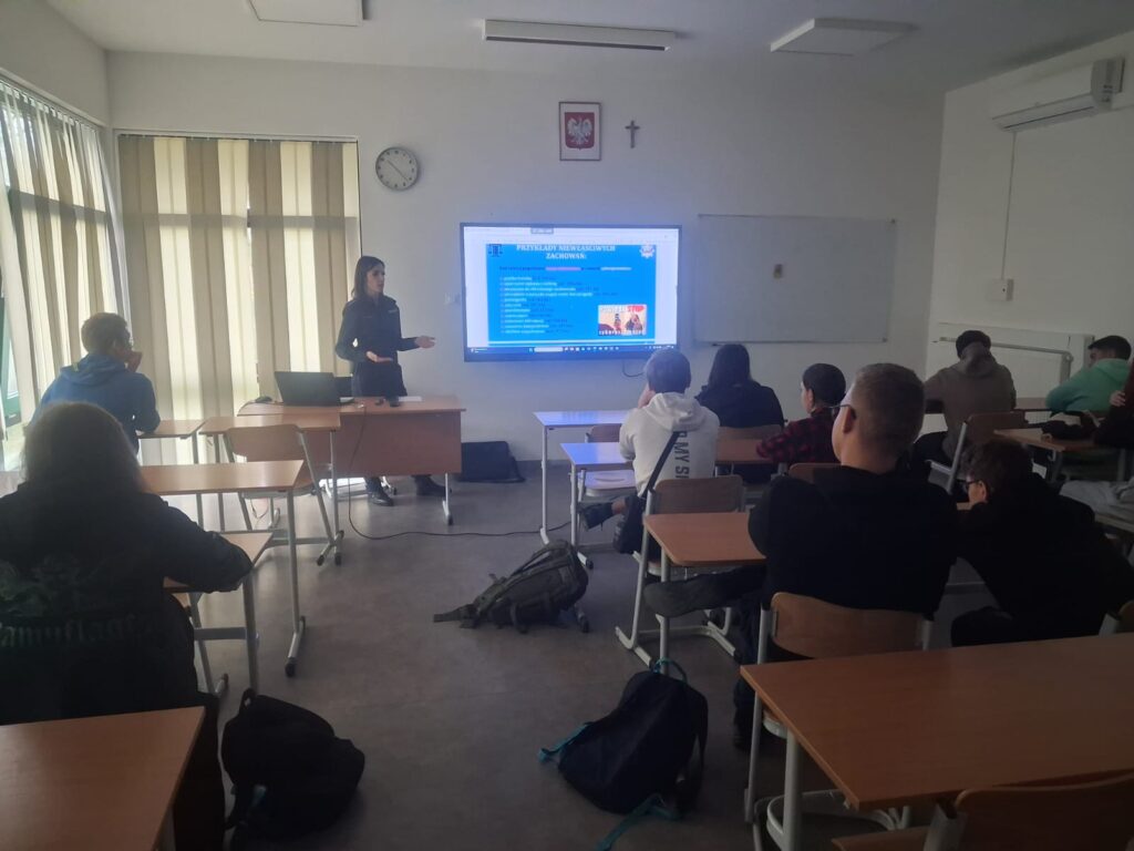 18 listopada klasy pierwsze Technikum i Liceum wzięły udział w warsztatach dotyczących cyberprzemocy, hejtu w Internecie i odpowiedzialności prawnej nieletnich, z tym związanej. Ten bardzo ważny w dzisiejszych czasach temat przybliżyła uczniom starszy aspirant Magda Sakowska.